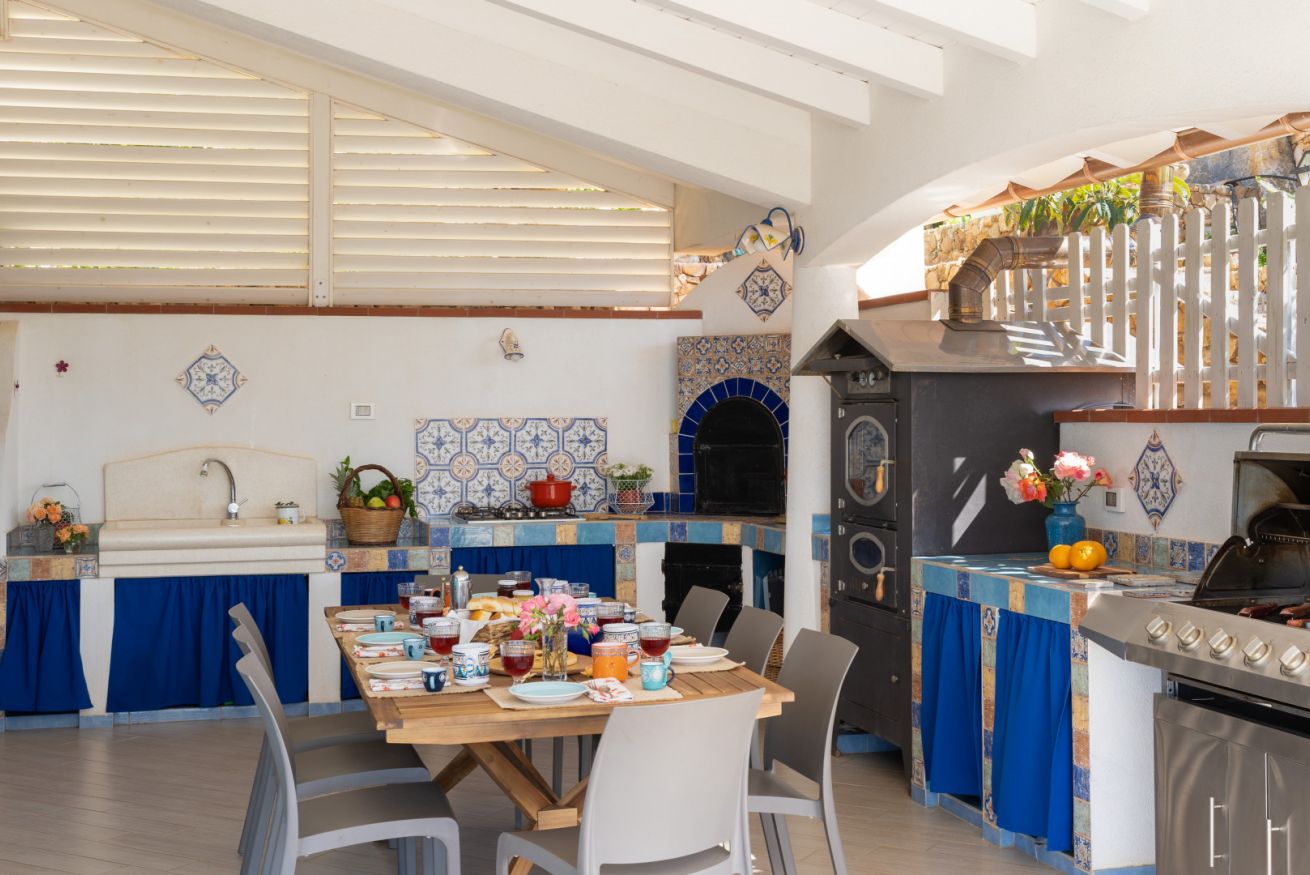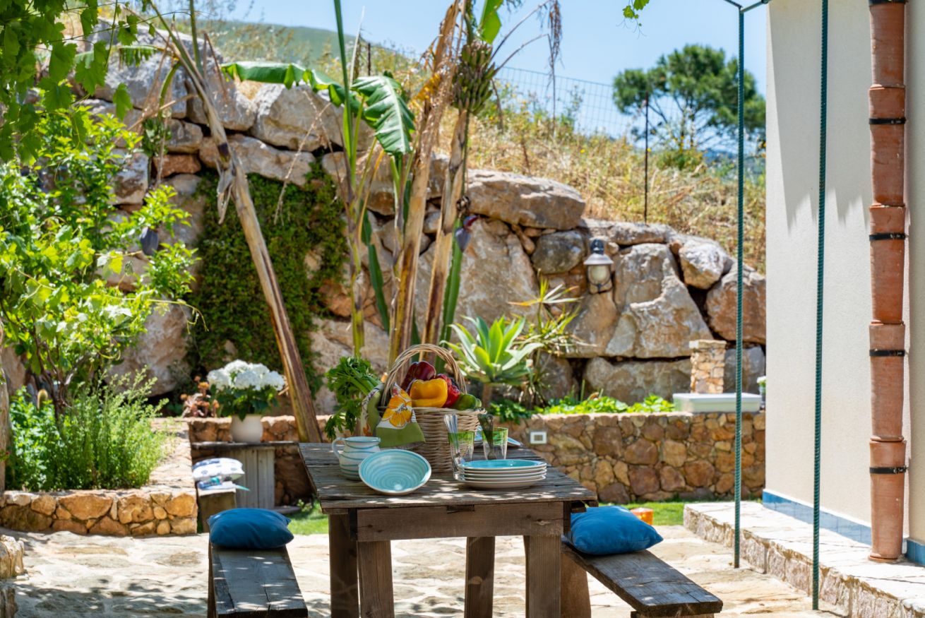 Qui di certo non mancano spazi all'aperto di cui godere infatti il progetto del giardino ruota naturalmente intorno alla villa con ritmo e in connessione col paesaggio circostante utilizzando piante della macchia mediterranea tipica della zona. Completamente recintato e di circa 1000 mq, si sviluppa su più terrazzamenti. Ogni zona esterna è stata minuziosamente progettata per vivere appieno ogni giornata tenendo conto della posizione del sole. Un'ampia veranda da dove si gode di una vista mozzafiato verso il mare è dotata di una cucina all'aperto completa di barbecue, forno a legna in muratura, forno a legna moderno ed un grande tavolo da cui ammirare tramonti. Completa il parco un parcheggio interno per 5 posti auto.