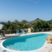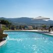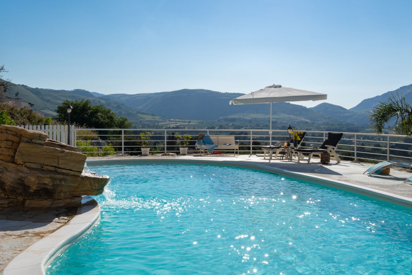 Aperta dall’ultimo sabato di aprile all'ultimo sabato di ottobre, la piscina è situata su un livello inferiore rispetto alla villa con accesso mediante scala in pietra naturale. Ha una forma irregolare con una superficie totale di circa 75 mq con profondità costante di 1,40 m. L’ingresso in acqua avviene tramite una comoda scala romana, dotata di una piacevole cascata e depurata a sale. Il bordo della piscina è antiscivolo e circondato da una pavimentazione in pietra, mosaici e resina mentre la vasca è rivestita in PVC ed è dotata di illuminazione interna. L’area prendisole è arredata con lettini e completata da una doccia esterna con acqua calda e fredda e frigo bar.