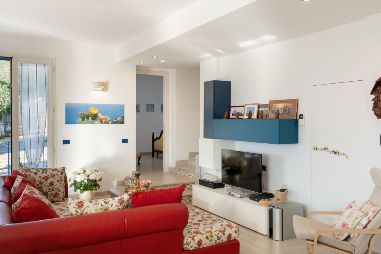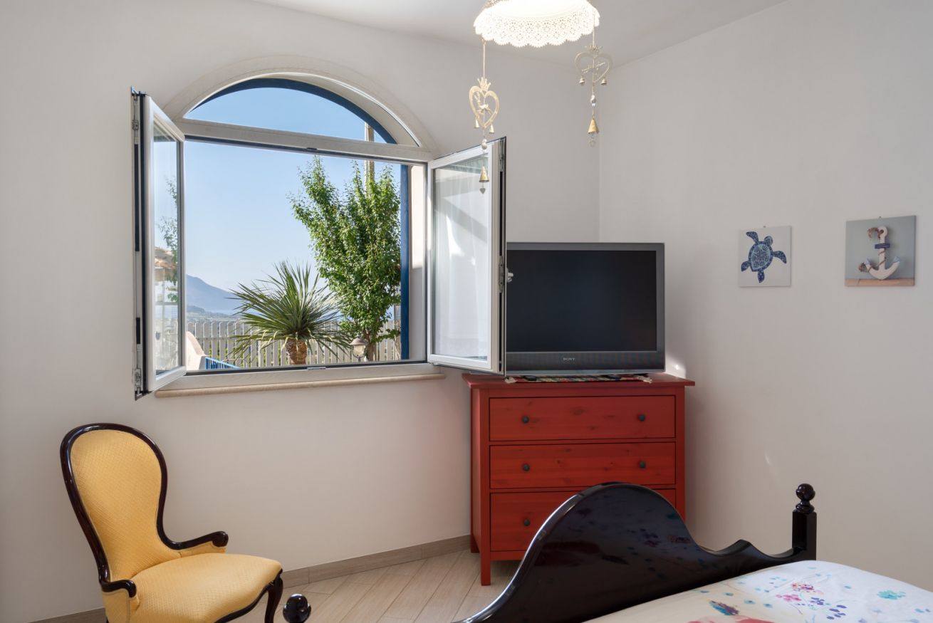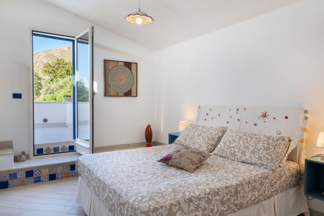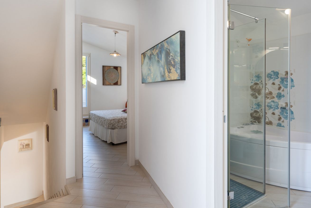 Villa Olimpia si sviluppa su due livelli , piano terra di mq 75 e piano primo mq 55. Il piano terra affaccia su un accogliente ampio living dotato di vetrate con vista mare che conferiscono un’atmosfera ariosa e spaziosa. L’ambiente conduce a una cucina con penisola attrezzata di tutti gli elettrodomestici, un antibagno con lavanderia e bagno con doccia. In un angolo del living é presente una scrivania con pc e stampante. ll piano è completato da una camera matrimoniale leggermente rialzata rispetto al livello del living. Tramite una scala decorata in maiolica si accede ad una seconda camera matrimoniale con terrazzo di pertinenza e un soppalco con scrivania e ad un bagno con doccia e vasca. Completano il piano una terza camera quadrupla con letto matrimoniale, un letto a castello e spogliatoio. La camera quadrupla ha accesso diretto ad un ulteriore ampio terrazzo. La casa gode di impianto filodiffusione e climatizzazione in tutte le camere da letto e soggiorno.