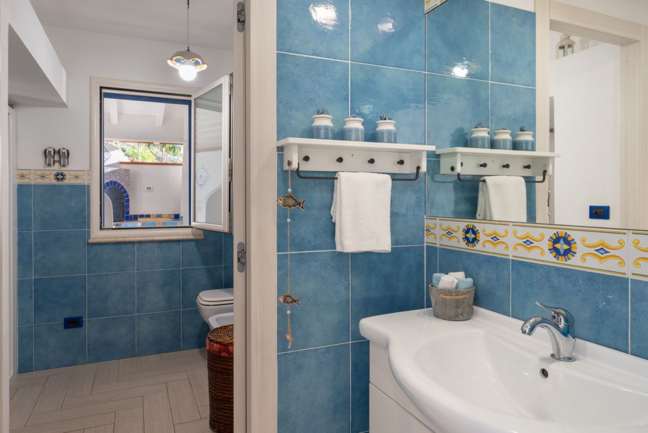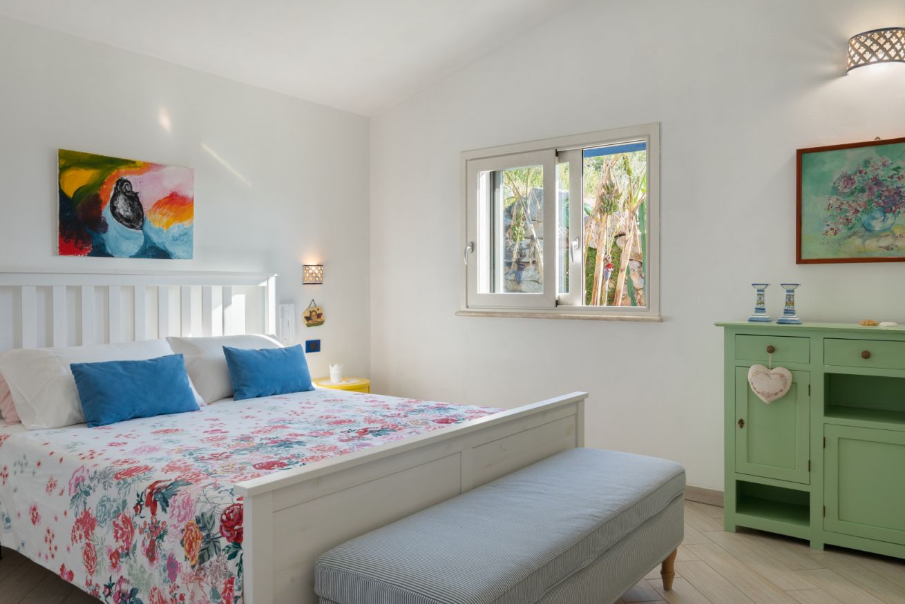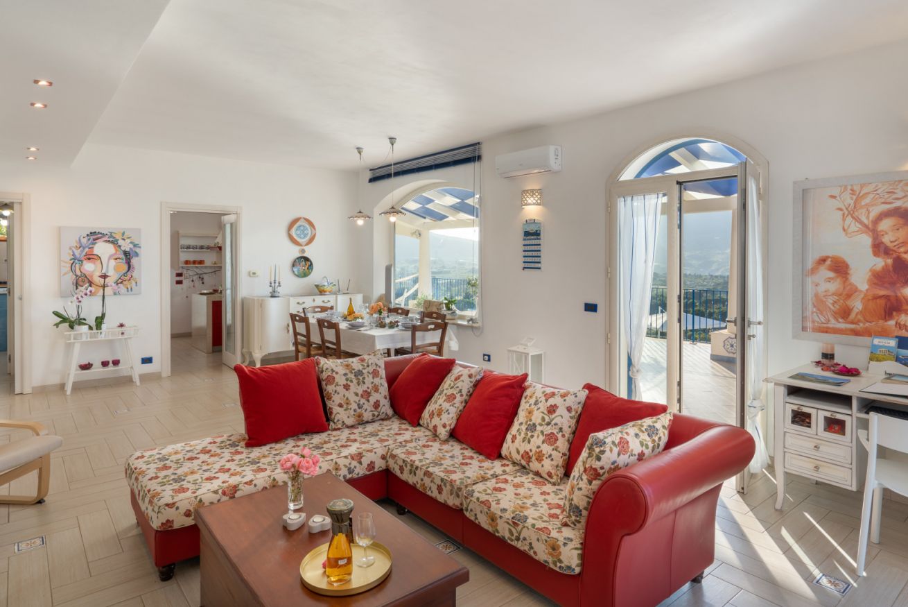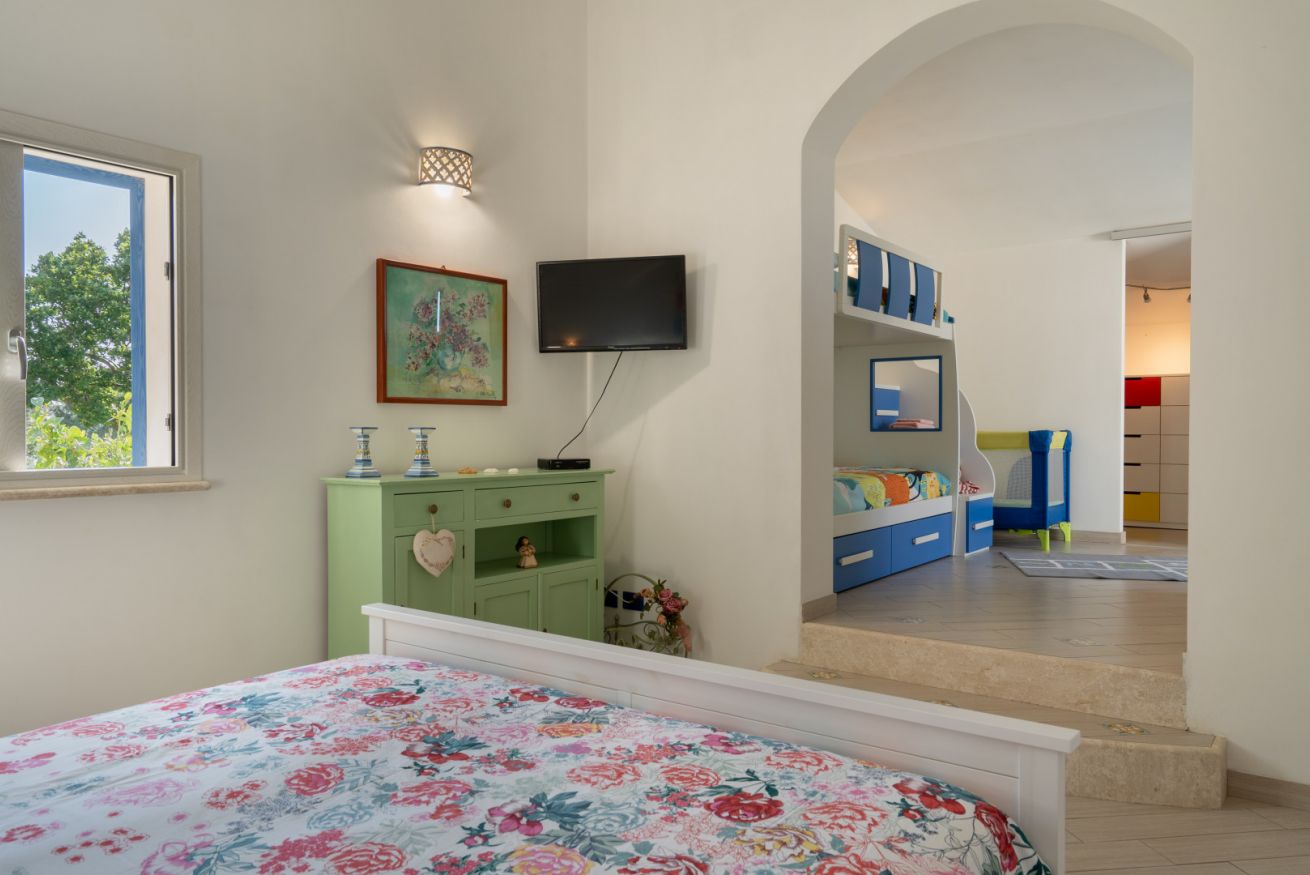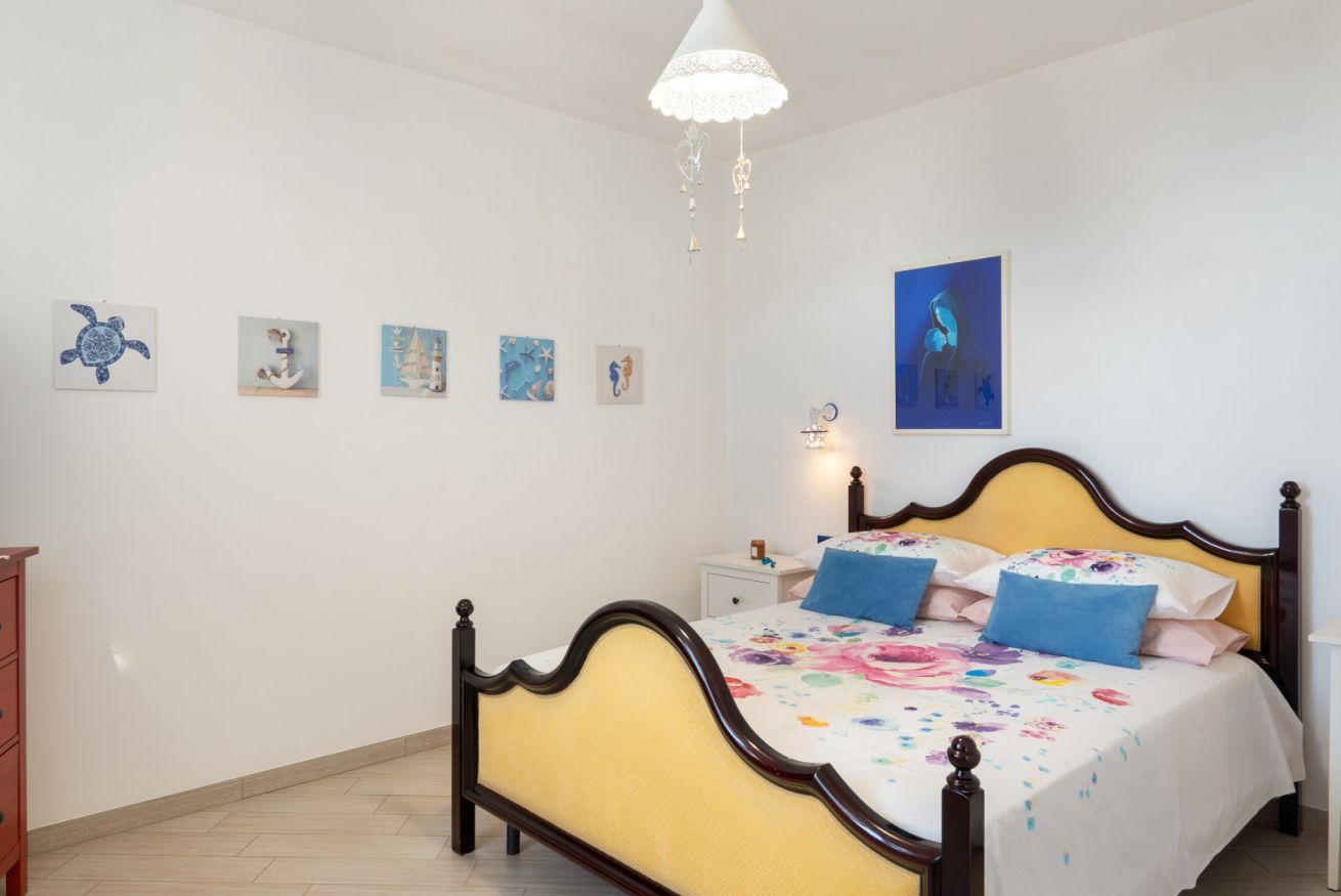 Villa Olimpia si sviluppa su due livelli , piano terra di mq 75 e piano primo mq 55. Il piano terra affaccia su un accogliente ampio living dotato di vetrate con vista mare che conferiscono un’atmosfera ariosa e spaziosa. L’ambiente conduce a una cucina con penisola attrezzata di tutti gli elettrodomestici, un antibagno con lavanderia e bagno con doccia. In un angolo del living é presente una scrivania con pc e stampante. ll piano è completato da una camera matrimoniale leggermente rialzata rispetto al livello del living. Tramite una scala decorata in maiolica si accede ad una seconda camera matrimoniale con terrazzo di pertinenza e un soppalco con scrivania e ad un bagno con doccia e vasca. Completano il piano una terza camera quadrupla con letto matrimoniale, un letto a castello e spogliatoio. La camera quadrupla ha accesso diretto ad un ulteriore ampio terrazzo. La casa gode di impianto filodiffusione e climatizzazione in tutte le camere da letto e soggiorno.