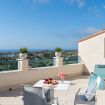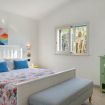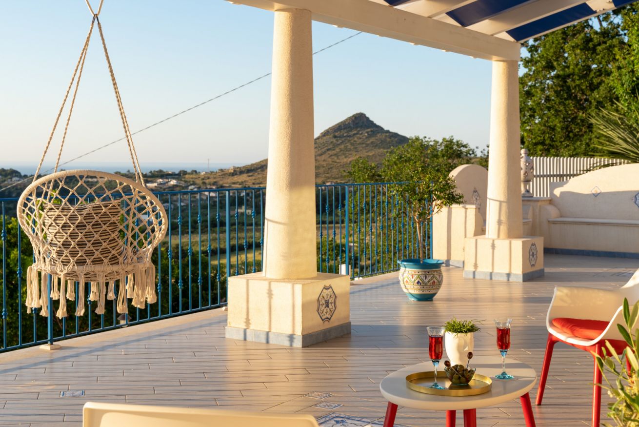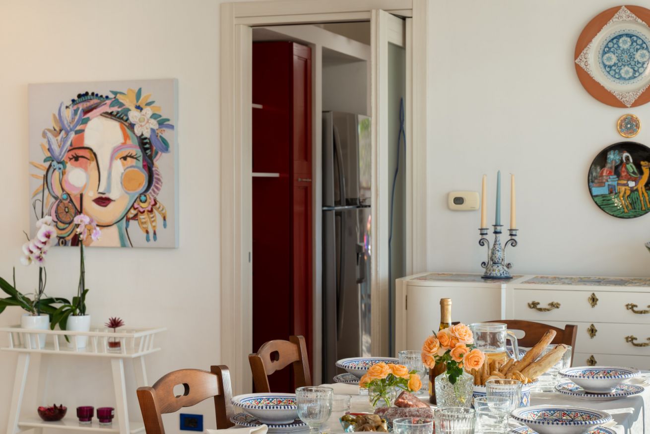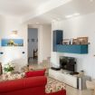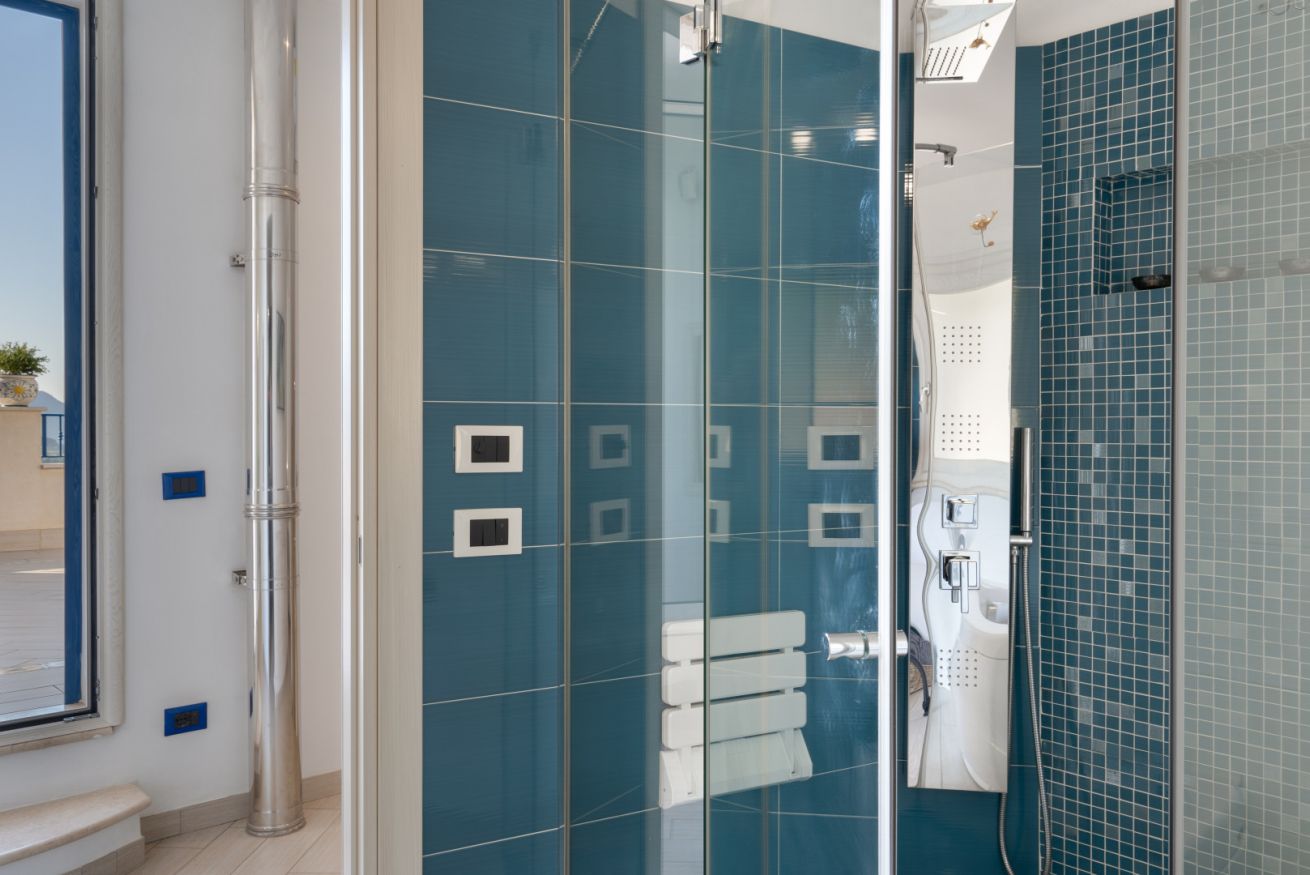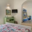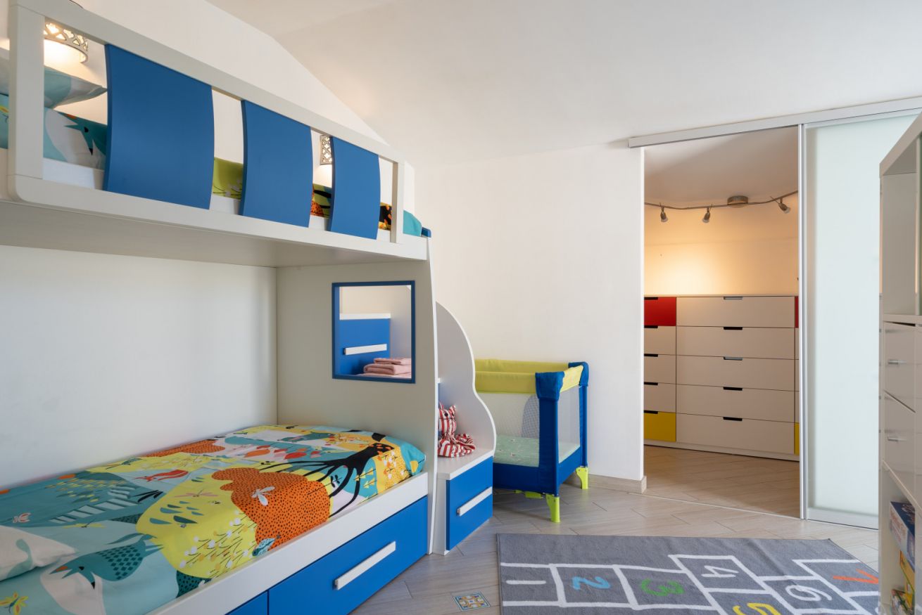 Villa Olimpia si sviluppa su due livelli , piano terra di mq 75 e piano primo mq 55. Il piano terra affaccia su un accogliente ampio living dotato di vetrate con vista mare che conferiscono un’atmosfera ariosa e spaziosa. L’ambiente conduce a una cucina con penisola attrezzata di tutti gli elettrodomestici, un antibagno con lavanderia e bagno con doccia. In un angolo del living é presente una scrivania con pc e stampante. ll piano è completato da una camera matrimoniale leggermente rialzata rispetto al livello del living. Tramite una scala decorata in maiolica si accede ad una seconda camera matrimoniale con terrazzo di pertinenza e un soppalco con scrivania e ad un bagno con doccia e vasca. Completano il piano una terza camera quadrupla con letto matrimoniale, un letto a castello e spogliatoio. La camera quadrupla ha accesso diretto ad un ulteriore ampio terrazzo. La casa gode di impianto filodiffusione e climatizzazione in tutte le camere da letto e soggiorno.